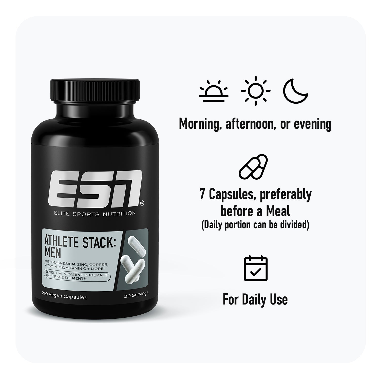 Vitamin and Mineral Blend 84% (Calcium Citrate, Magnesium Citrate, Potassium Citrate, Vitamin E (Mixed Tocopherols), Vitamin C (Ascorbic Acid), Iron Bisglycinate, Zinc Bisglycinate, Anti-Caking Agents (Magnesium Salts of Fatty Acids, Silicon Dioxide), Niacin (Nicotinamide), Folic Acid (Pteroyl Monoglutamic Acid), Pantothenic Acid (Calcium D-Pantothenate), L-Selenomethionine, Vitamin D (D3/Cholecalciferol), Manganese Bisglycinate, Biotin (D-Biotin), Vitamin B6 (Pyridoxine Hydrochloride), Chromium Picolinate, Sodium Selenite, Thiamine (Thiamine Mononitrate), Riboflavin (Vitamin B2), Vitamin K (K2/Menaquinone-7), Vitamin A (Retinyl Acetate), Copper Bisglycinate, Vitamin A (Beta-Carotene), Potassium Iodide, Vitamin B12 (Methylcobalamin, Adenosylcobalamin, Hydroxocobalamin Acetate)), Capsule Shell (Hydroxypropylmethylcellulose).Athlete Stack Men Key Facts