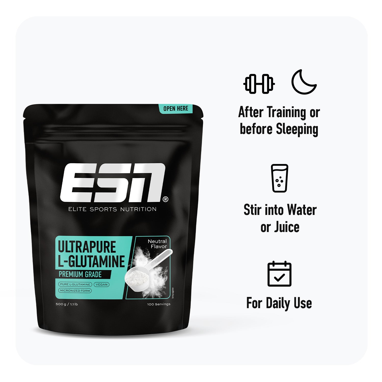 Ultra pure, ultra effective - Ultrapure L-Glutamine Powder. The non-essential amino acid L-glutamine is contained in protein, which supports your muscles during regeneration, building and maintenance.¹ The ideal muscle support after intensive training.²