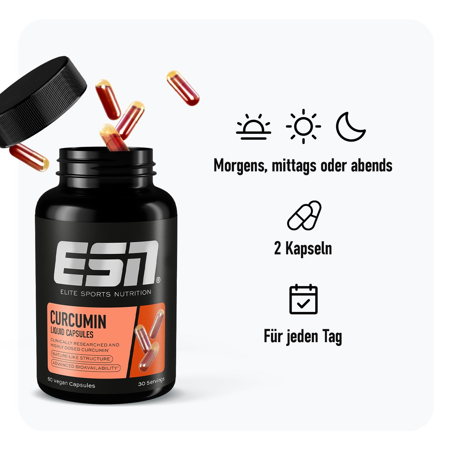 Get plant power – mit unseren Curcumin Liquid Capsules. Die hochwertigen Kurkuma-Kapseln enthalten die patentierte Premium NovaSol®-Flüssigform und bieten damit eine 185-fach bessere Bioverfügbarkeit als gewöhnlicher Pulverextrakt – standardisierte Qualität und Reinheit für volle Curcuma-Power in Kapseln.